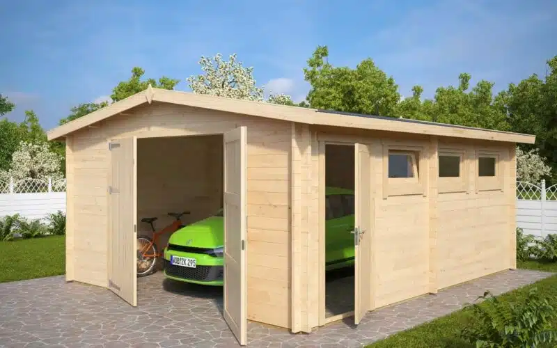 The extra wide Hansa B Garage is worth considering if you are looking for great value for your money! Extra space at the sides can be used for garden storage or even setting up a small corner for your DIY projects. All our extra wide garages have much more space on the sides than an entire average garden shed does. Double glazed windows, metal storm braces, roofing felt and sturdy 44mm wall planks are all included in the standard kit as well as all other necessary components and fixings to get your garage built.