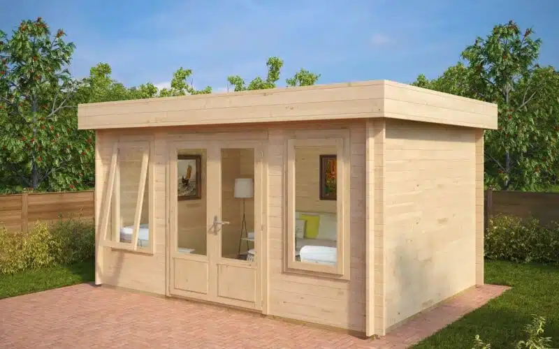 Jacob D is a perfect example of a modern,  wooden garden office or NEW looking hobby room. The bright and spacious Jacob D has French doors and longer windows, allowing light to illuminate the inside of the garden log cabin. Jacob D is also quick and easy for DIY installation.
