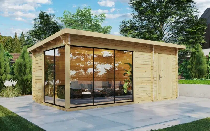 Introducing the “Arnold,” a modern summer house that perfectly combines style and functionality. Featuring two aluminum sliding doors, this cabin lets in ample natural light, creating a bright and inviting space while giving it a sleek, contemporary look. The “Arnold” is designed for versatility, offering a spacious garden room alongside a convenient side shed for all your storage needs. Built with thick 70mm walls, this wooden cabin is exceptionally strong, sturdy, and long-lasting, ensuring durability in all weather conditions. Upgrade your outdoor living space with the “Arnold” and enjoy a blend of elegance, practicality, and enduring quality.