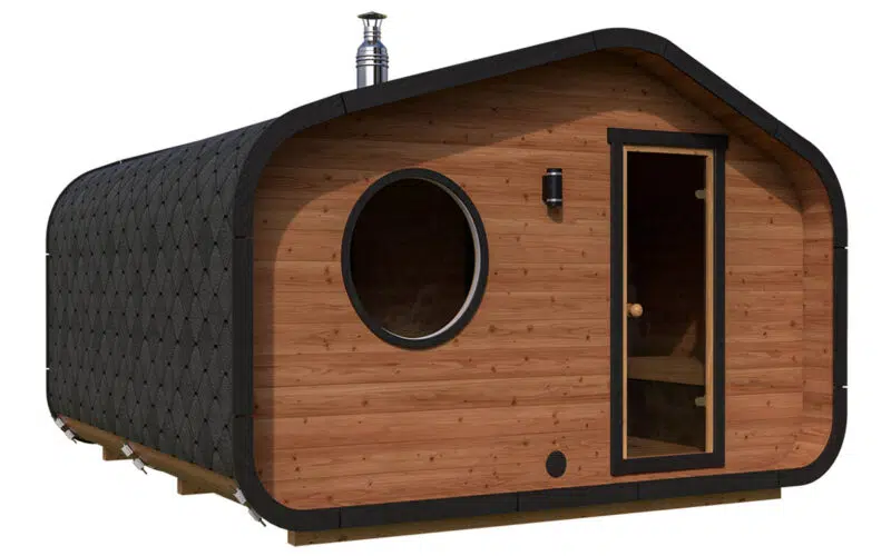 Outdoor garden sauna “Mont Blanc” features a beautiful and unique design, that’s guaranteed to stand out as an elevated choice. The inside features a spacious front room with ample seating for socialising, a large steam room and a shower room. Want to make it even more special? Choose the panoramic window option with or without mirror panelling.