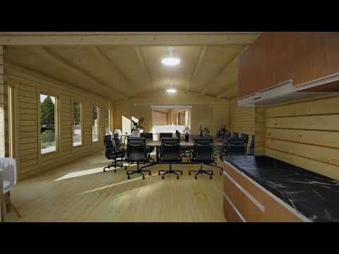 The Classroom-Conference Room log cabin’s walls, rafters and roof joists are all made of glulam wood, which ensures significantly higher stability, durability and excludes twisted or bended beams that may occur with normal wood, especially in long lengths. This twisting is common in normal timbers, when the weather is very hot for a period and then suddenly wet and vice versa. It is not too much of a problem in smaller garden buildings but a room of this size and function needs the consistency and resilience glulam timber offers. Moreover, this premium class timber cabin features our very best double glazed (tempered safety glass) doors and windows for superb thermal performance, extra thick 28mm floor boards, strengthening metal rods in walls and extra thick 94mm impregnated foundation beams. Windows are equipped with German made tilt and turn systems, while all exterior doors have German made multi-lock systems. Together with our optional roof and floor insulation kits and a heating system, this high quality log cabin can be used all year round as a classroom, nursery, conference room, gym, restaurant, pub or a large showroom.