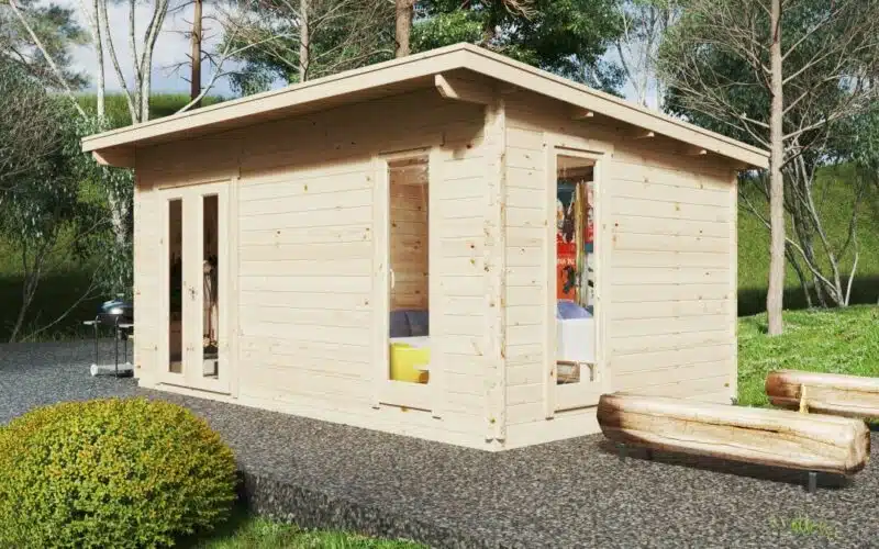 The Mia 2 garden log cabin is one of our most affordable medium sized buildings with internal shower room and WC. It is an ideal cabin to use whether you are building a camping site, rental cabin or a guesthouse in your back garden, office or a studio. The standard cabin kit includes 44mm wall thickness, double glazing in doors and windows, durable 18mm floor boards, tempered safety glass as well as high quality European made door and window hardware. All wooden cabin components are made of slow grown Nordic spruce.