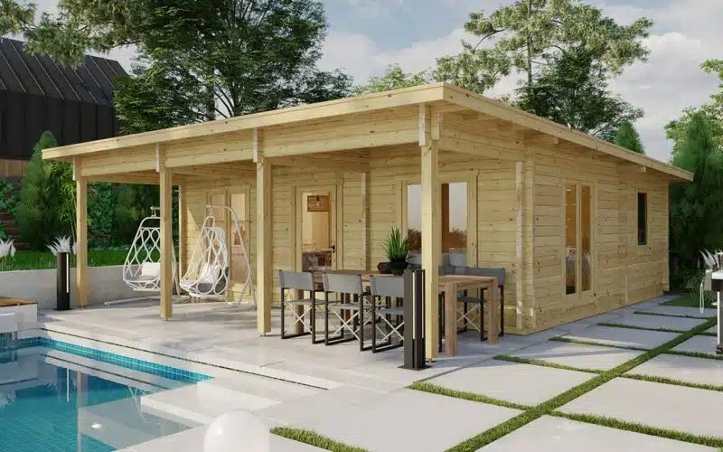 The Hansa Holiday R log cabin provides an excellent combination of indoor and sheltered outdoor area. With almost 40 m2 of living space, this log cabin has an 8 x 2m canopy from which to enjoy summer sunshine. This luxurious log cabin can be used as a spacious granny annex, generous guest house, rental cabin or as a summer house for the family. This cabins standard kit includes 70mm thick wall planks, double glazed doors and windows, in wall strengthening rods and all fixings required for assembly. These features ensure great stability and a very long-life span for your cabin but don’t forget that all our buildings come with 5-year manufacturers guarantee for your peace of mind. This is a large structure and so considerable previous experience is recommended if you are planning to build this cabin yourself or alternatively our assembly team can fit this log cabin within 3-4 days.